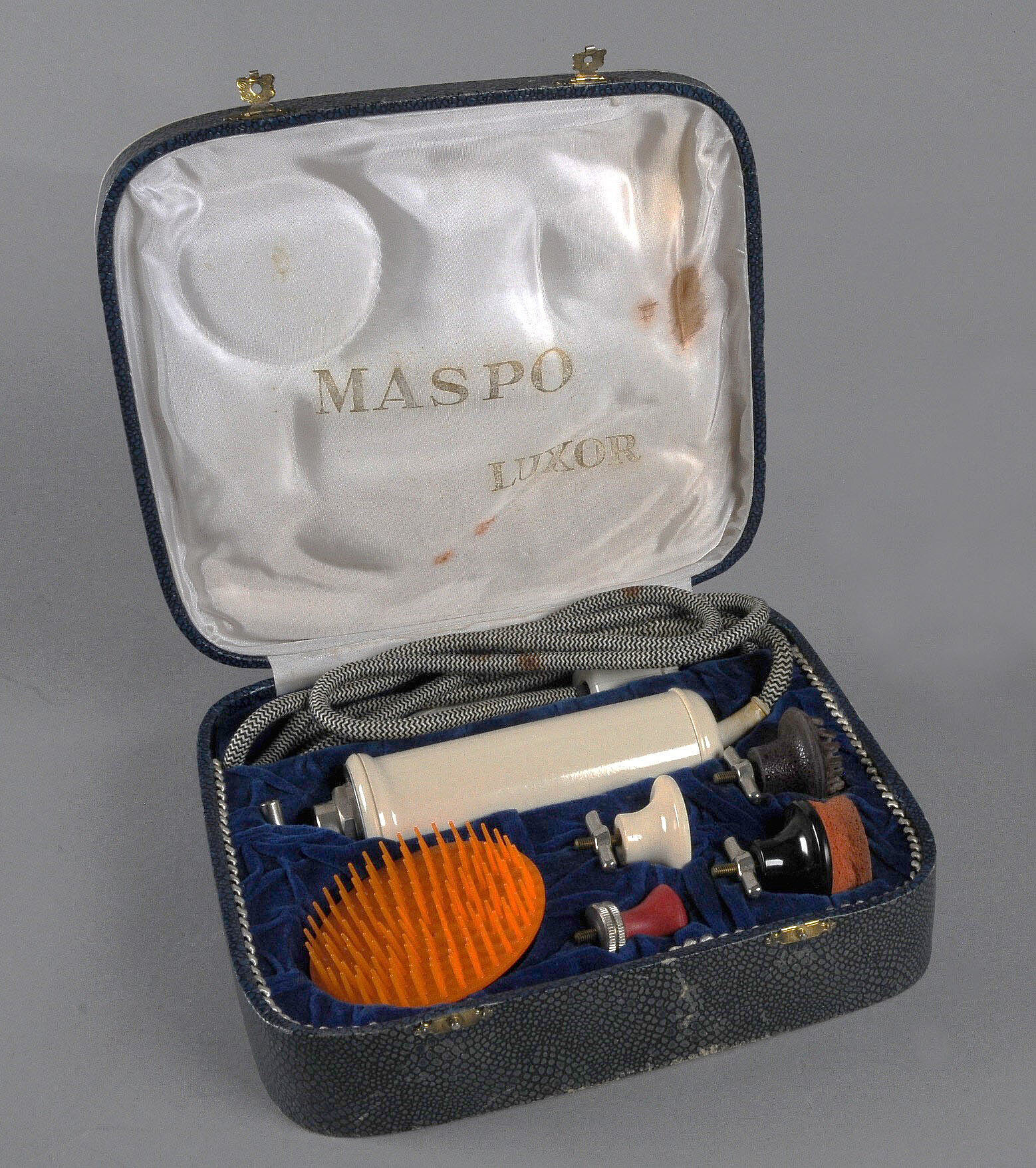 In Samt gebettet im Etui mit Schlangenhaut-Optik: Vibrations-Massagegerät „LUXOR“, dazu fünf Aufsätze mit unterschiedlicher Leistung. Sie werden jeweils auf den Griff aufgeschraubt. MASPO (= MASsage & SPOrt) ist seit 1950 in der Wellnessbranche eine sehr erfolgreiche Marke. Sie steht für hochwertige Massageprodukte aus eigener Herstellung und gehört der vielseitig tätigen Sanitätshaus Wesing GbR in Pulheim (Nordrhein-Westfalen) an. Inv.-Nr. 24/256, im Freilandmuseum seit 2024. (Foto: Juliane Sander)