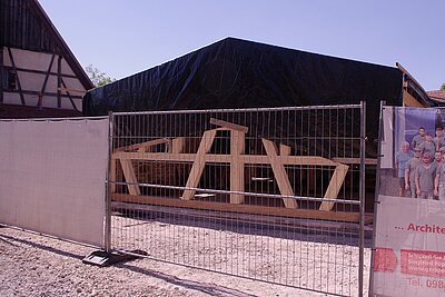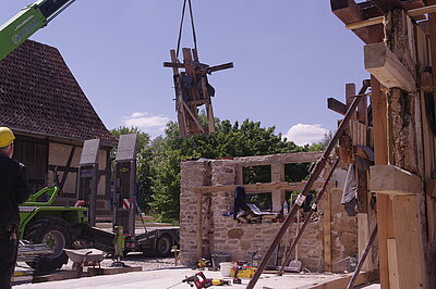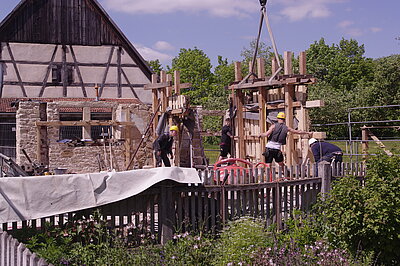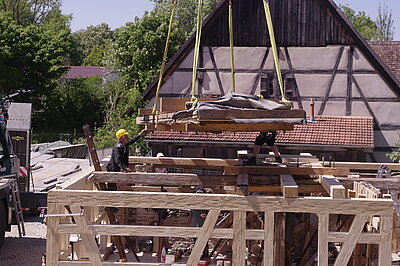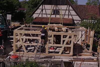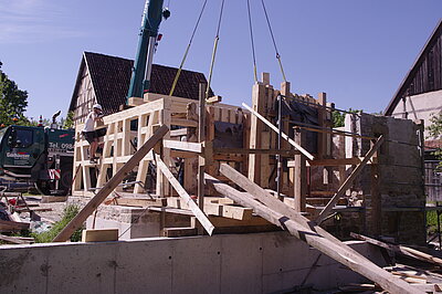 Nach den entsprechenden Vorbereitungen in den Wintermonaten konnten während einer dreitägigen Aktion von Montag, den 31.5. bis Mittwoch, den 2.6.2021 alle für das Erdgeschoss der Synagoge relevanten Bauteile inklusive der Deckenelemente zum Obergeschoss aufgestellt werden. Hierzu zählen sowohl die mitgenommenen originalen Wandscheiben als auch die rekonstruierten Fachwerkbauteile der östlichen und südlichen Außenwände.