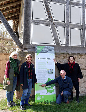 Victoria Swank (Zweite von links) mit (von rechts) Museumsleiterin Dr. Karin Falkenberg, Ulrich Herz und Friederike Enser an der Ölmühle des Freilandmuseums. Ihre weite Anreise zum Museum hat der Amerikanerin Victoria Swank in der Geländeausstellung anlässlich des 50. Jubiläums des Fördervereins eine Erwähnung eingebracht, die entsprechende Ausstel-lungstafel steht an der Ölmühle.