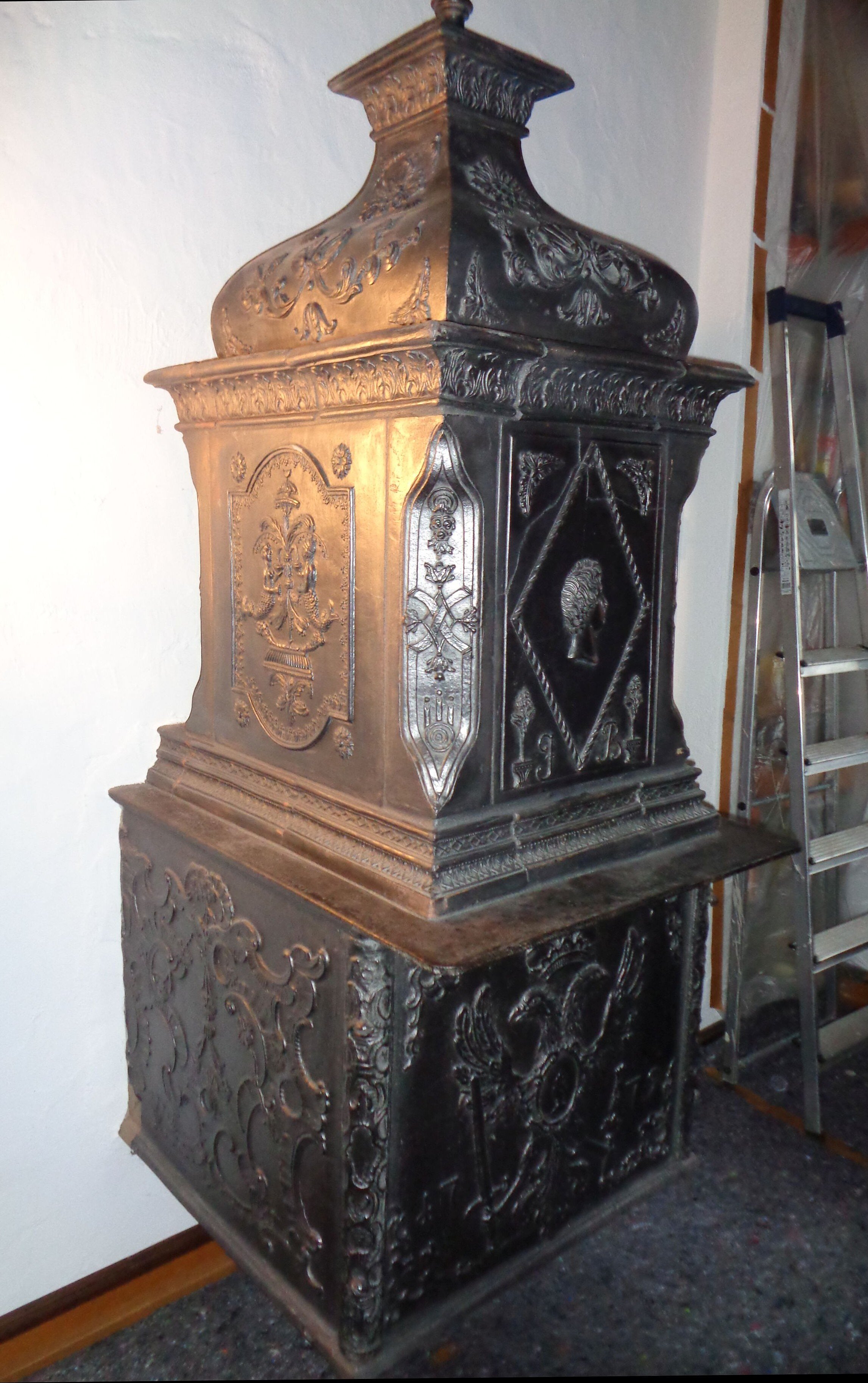 Unser Ofen ist ein durchaus typisches Beispiel für einen barocken Plattenofen, wobei die Platten aus Gusseisen oder als großformatige Kacheln mit graphitierter Oberfläche gefertigt wurden – in letzterem Fall wird eine hochwertige Metalloberfläche nachgeahmt. Solche Plattenöfen waren vor allem in der Oberschicht zu finden, also in Schlössern und Herrensitzen wie eben in Birnthon. Doch auch in wohlhabenden städtisch-bürgerlichen und bäuerlichen Haushalten sind aufwendige und repräsentative Öfen anzutreffen. Die künstlerische Gestaltung ist gleichermaßen Ausdruck von Status und Zugehörigkeit.