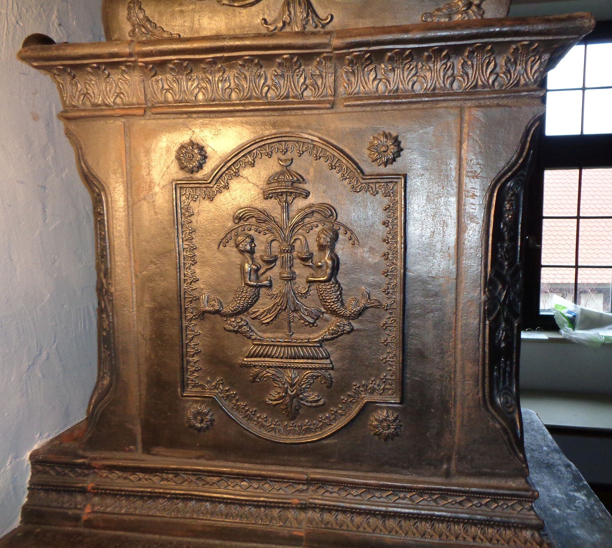 Die Seitenplatten des Ofenaufsatzes zeigen jeweils zwei Wasserfrauen mit einem Springbrunnen als Motiv. (Foto: Dieter Gottschalk)