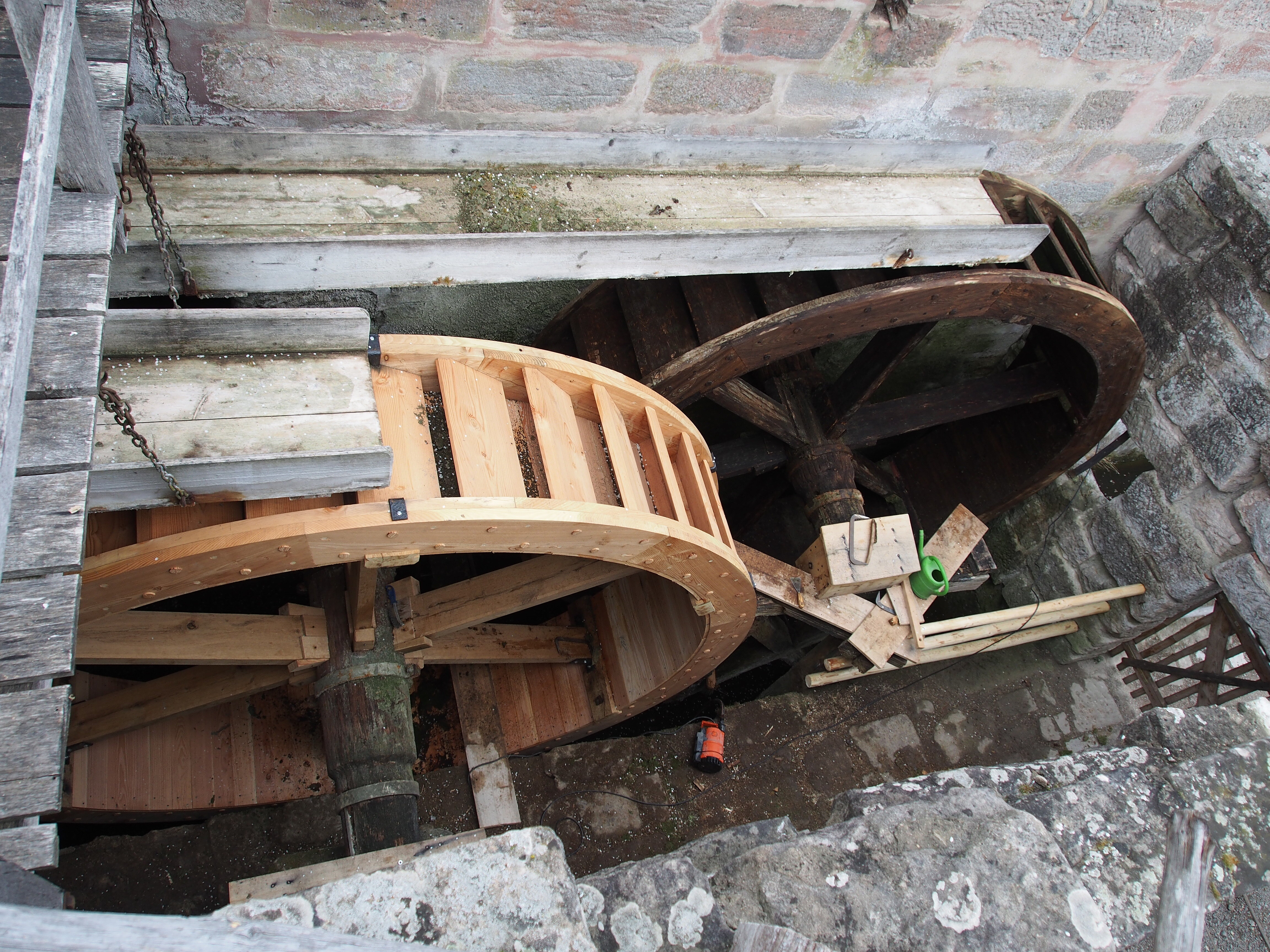 Beide Mühlräder sind fertig – das eine neu, das andere sauber.